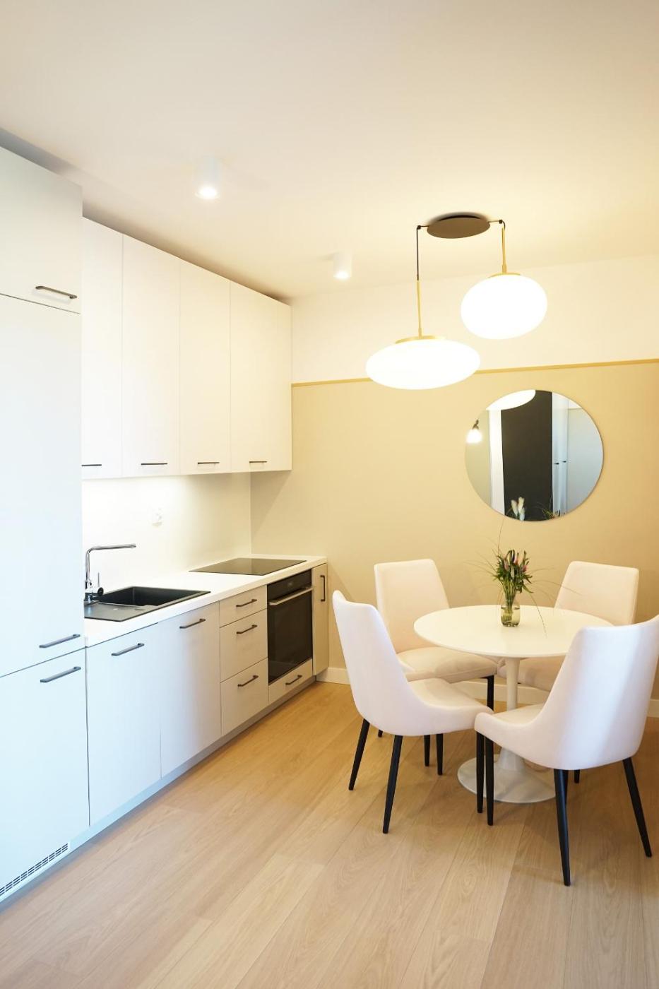 Oferta apartamentu obejmuje sypialnię (1), salon, kuchnię z pełnym wyposażeniem, w tym lodówką i ekspresem do kawy, a także łazienkę (1) z prysznicem oraz suszarką do włosów. W apartamencie zapewniono ręczniki i pościel.
