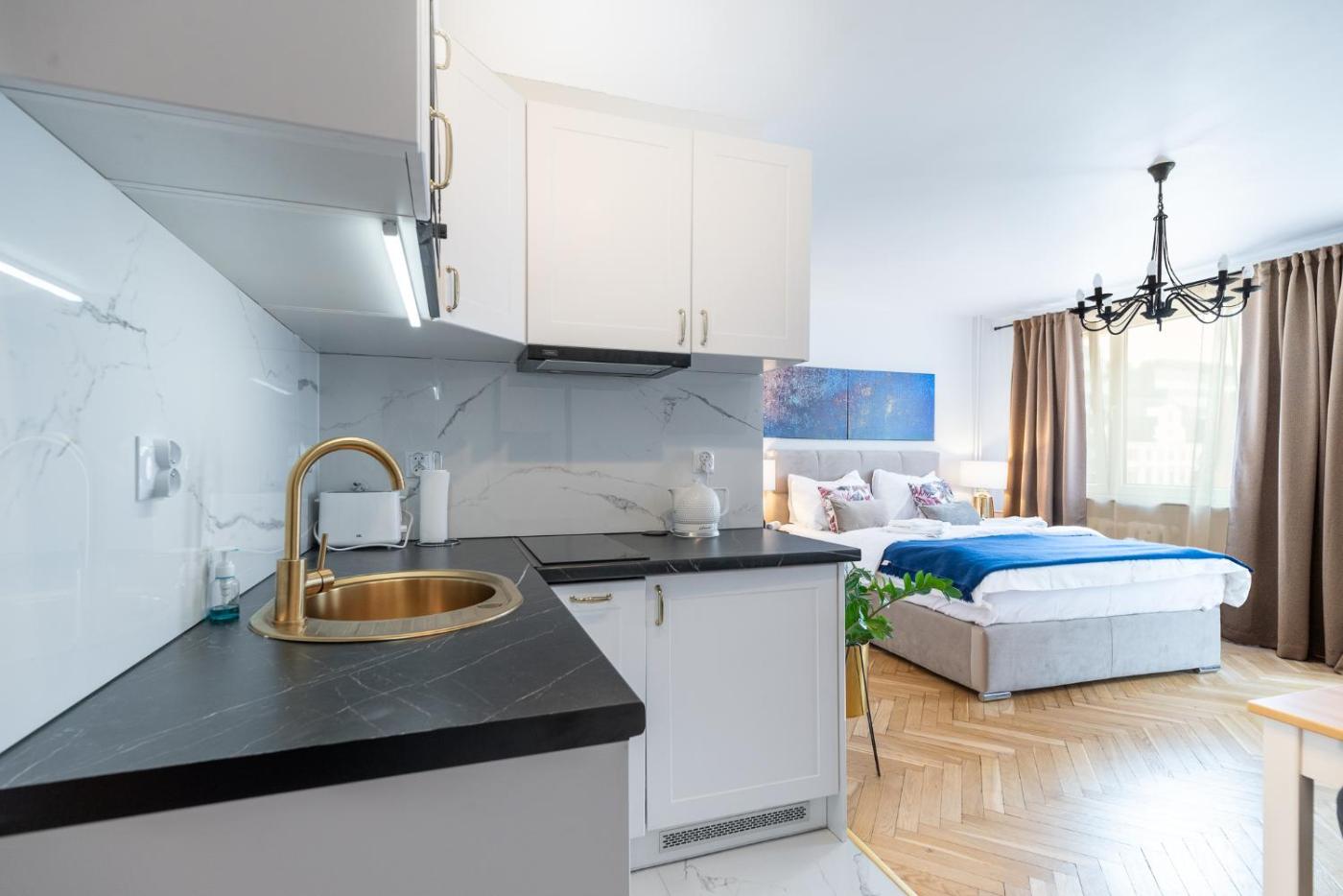 Studio z łóżkiem typu king-size i rozkładaną sofą. The studio features a sofa, a tiled floor, as well as a private bathroom featuring a shower and a hairdryer. In the fully equipped kitchenette, guests will find a stovetop, a refrigerator, a dishwasher and kitchenware. The air-conditioned studio provides a flat-screen TV with cable channels, a tea and coffee maker, a dining area, a wardrobe as well as city views. The unit offers 2 beds. Studio - 4 osobowy. Powierzchnia pokoju ok.: 26 mkw.
